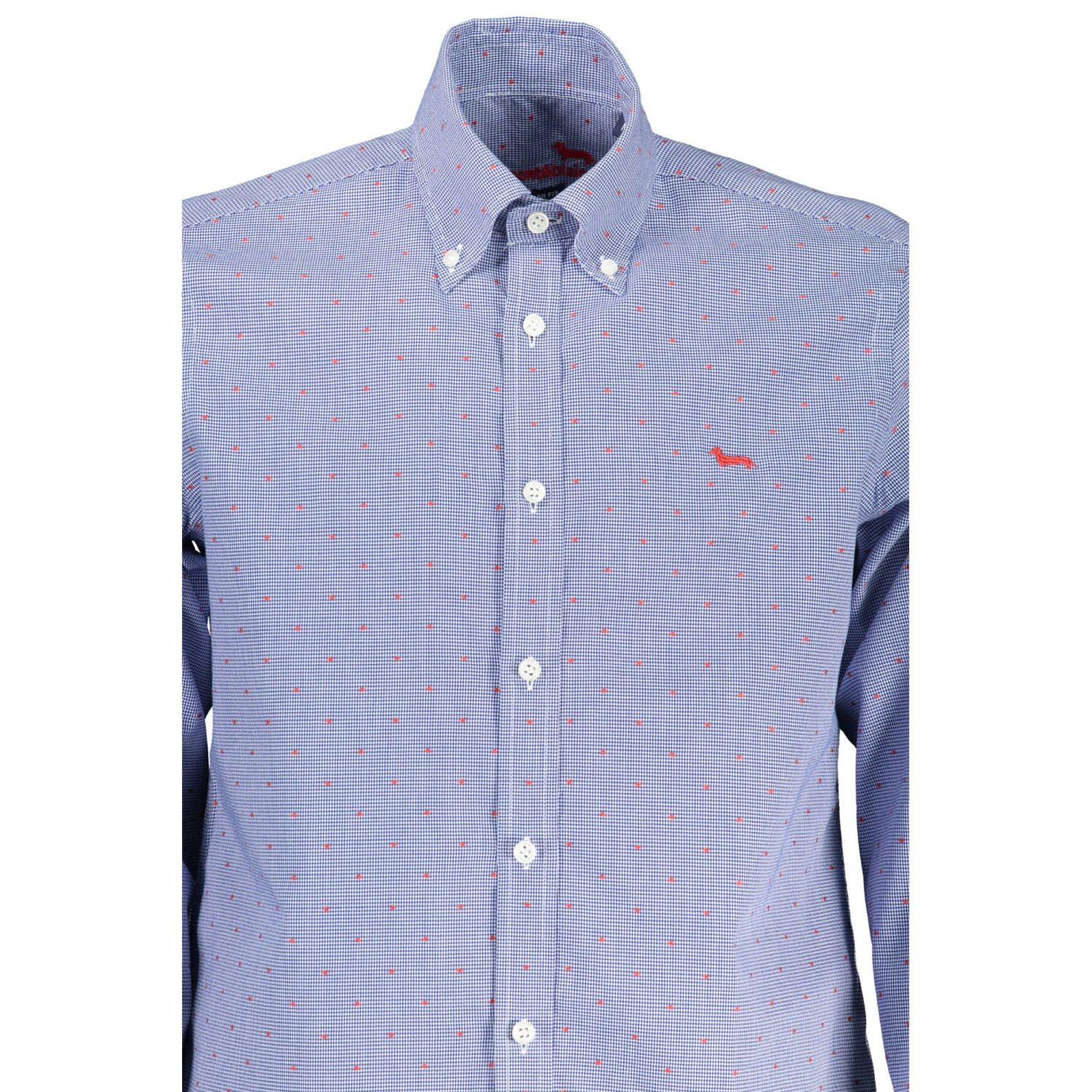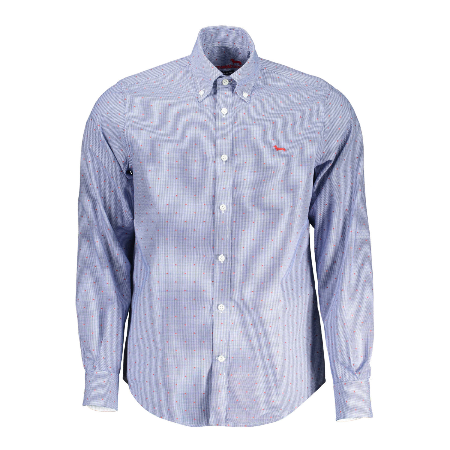 camicia regular fit, maniche lunghe, collo button down, polsini 1 bottone, interno polsini in contrasto, bottoni, dettagli a contrasto, logo