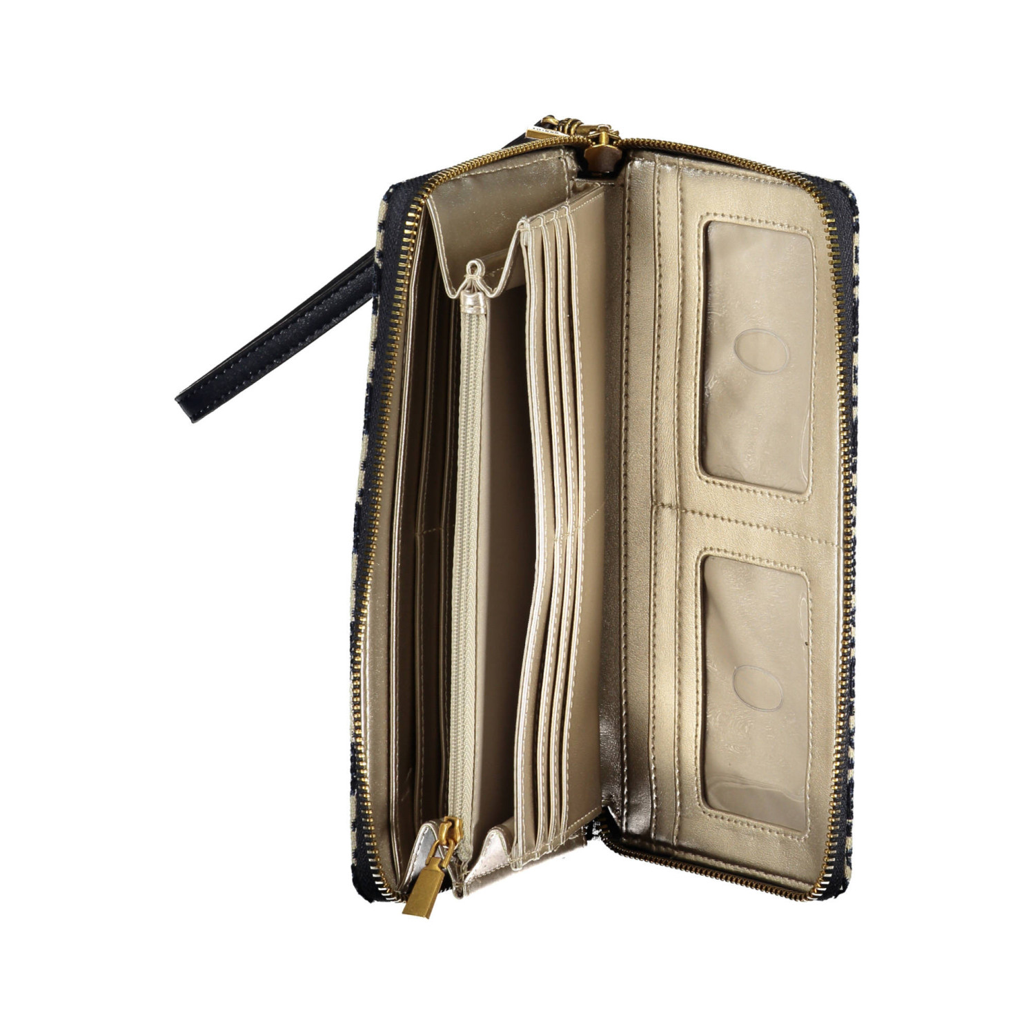 portafoglio 3 scomparti, portamonete, spazi interni formato da card, dettagli a contrasto, chiusura con zip, tiralungo removibile, logo