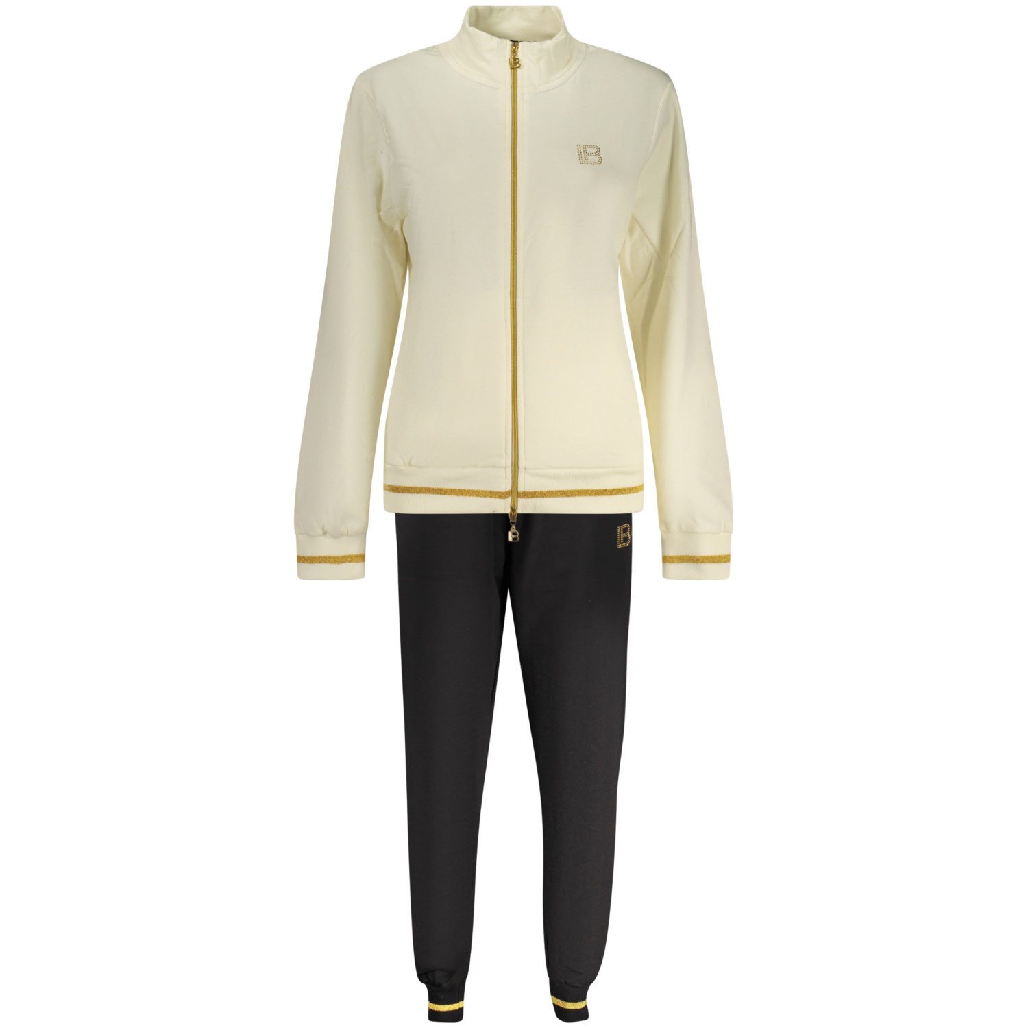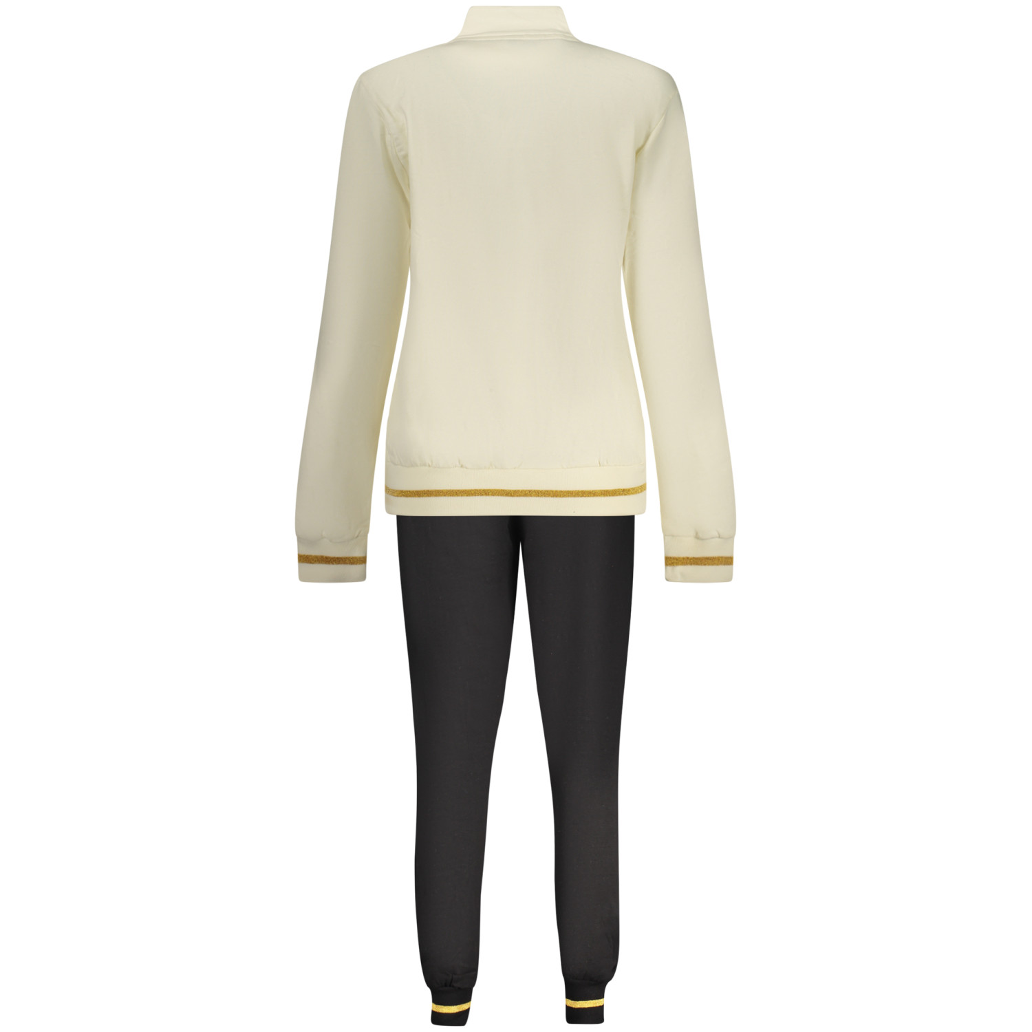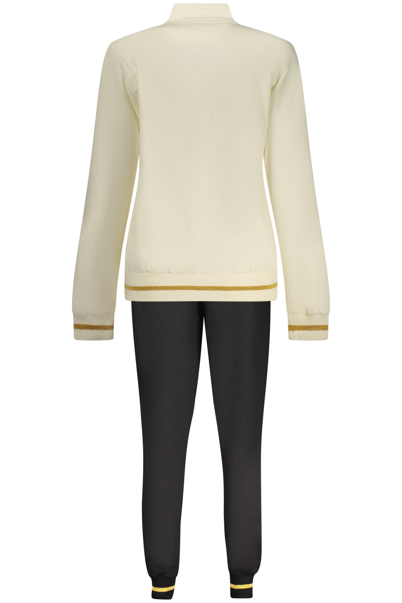 TUTA SPORTIVA FELPATA, FELPA MANICHE LUNGHE IN BIANCO, 2 TASCHE, FULL ZIP, PANTALONE NERO, ELASTICO IN VITA CON LACCI, 2 TASCHE, DETTAGLI A CONTRASTO, APPLICAZIONE STRASS, LOGO